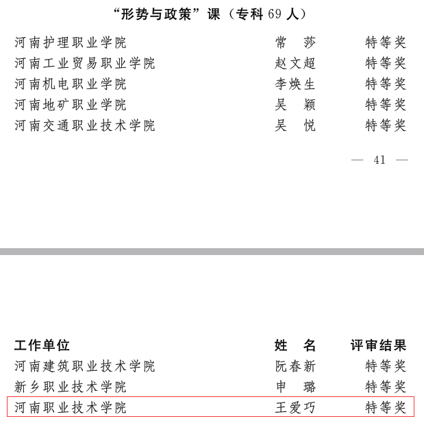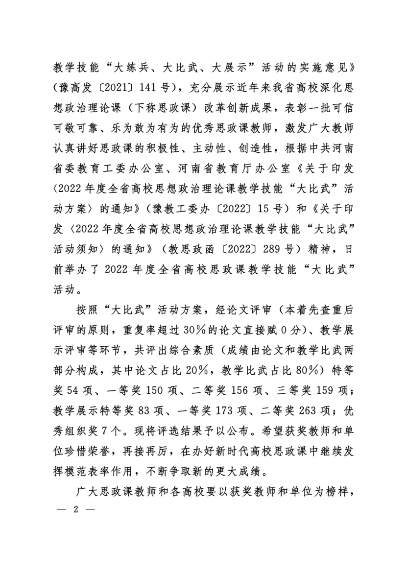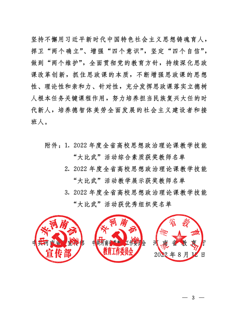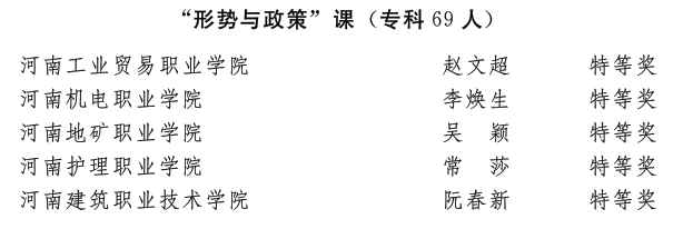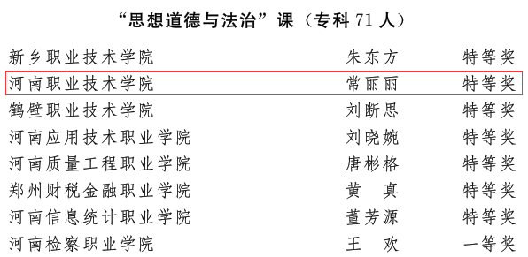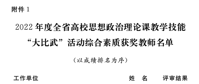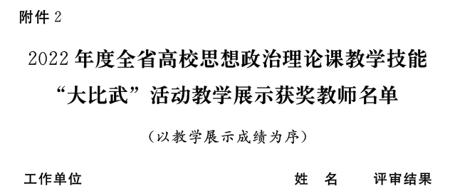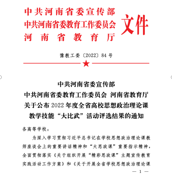 近日,省委宣传部、省委教育工委、省教育厅发文公布了2022年河南省高校思想政治理论课教学技能“大比武”活动的评选结果,我校ylzzcom永利总站王爱巧、常丽丽老师在综合素质、教学展示环节中分别获得两项特等奖,张倩老师获得两项一等奖。